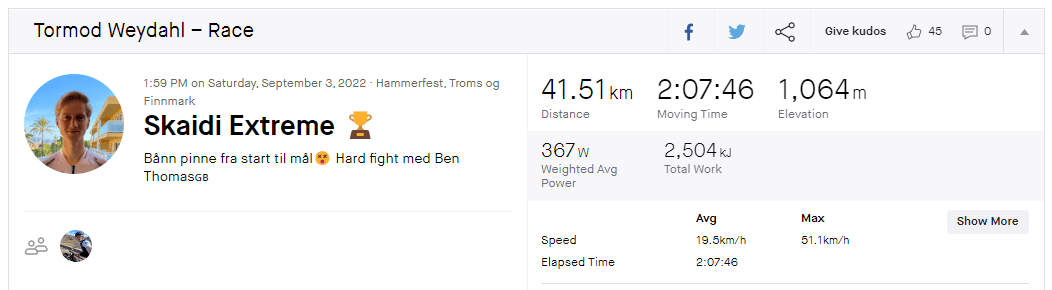 Gratulerer Tormod Weydahl med framifrå innsats i Skaidi Xtreme! Ifølge Tormod var det fyr på alle sylindre fra start til slutt, og beinhard kniving med Ben Thomas (3x British mester). Tormod knakk han i spurten (se video under).