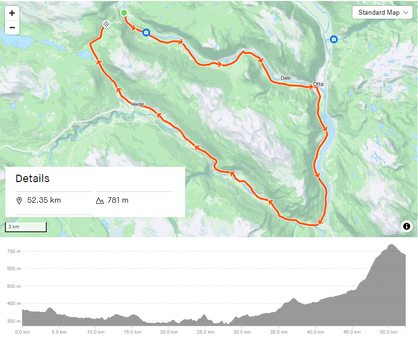 Første etappe er fellesstart landevei. Start ved JT-sykkel/bru, sykler baksida fra Lalm til Sjoa, videre oppover til Bjølstadmo og Heidalsskogen, målgang ved avkøyring til Rindsetra.