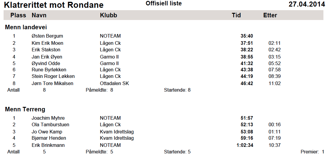 Rytterene startet med handicap etter Birk-tid i fjor, og selv om Østen Bergum fra Kvam brukte kortest tid på de 14 kilometerene fra Kvam til Rondablikk, så var det OSK-medlem Jan Erik Øyen, som i dag representerte Garmo IL, som var først i mål.