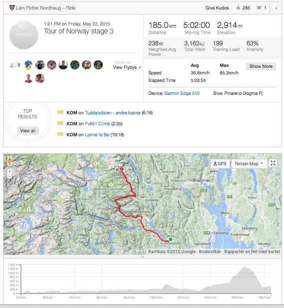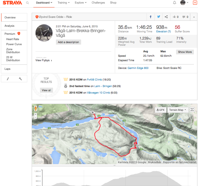 Øverst ser man et sammendrag av turen – som distanse, tid, hastighet, snittfart, snittpuls, makspuls, maksimal hastighet og estimert watt. På grunn av av jeg er Premium member og har wattmåler ser jeg noen ekstra tall. Videre lengere ned ser du hvilke segmenter du gjorde det best på på denne turen. Mer om segmenter senere. Videre ser du et kart og en høydekurve over turen. Skroller du lengere ned på sida vises også alle segmentene du har kjørt på denne turen, men det ble det ikke plass til på dette bildet.